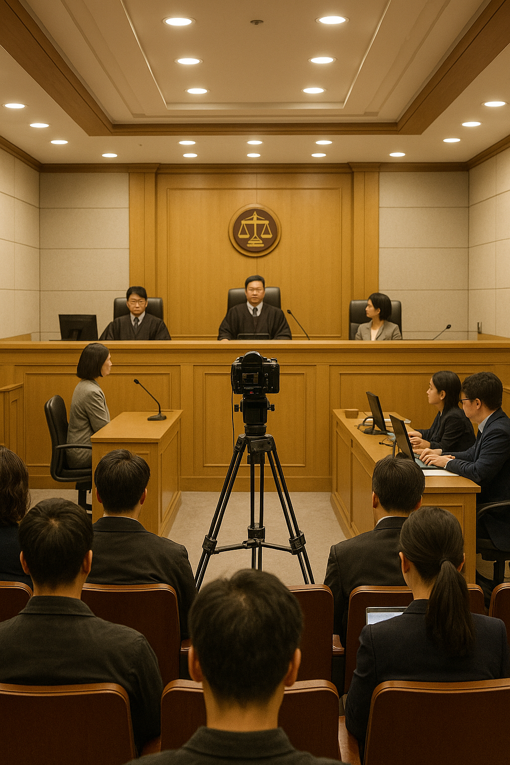 카메라가 설치된 법정의 긴 조명 아래, 증인의 한마디가 공기처럼 퍼집니다.