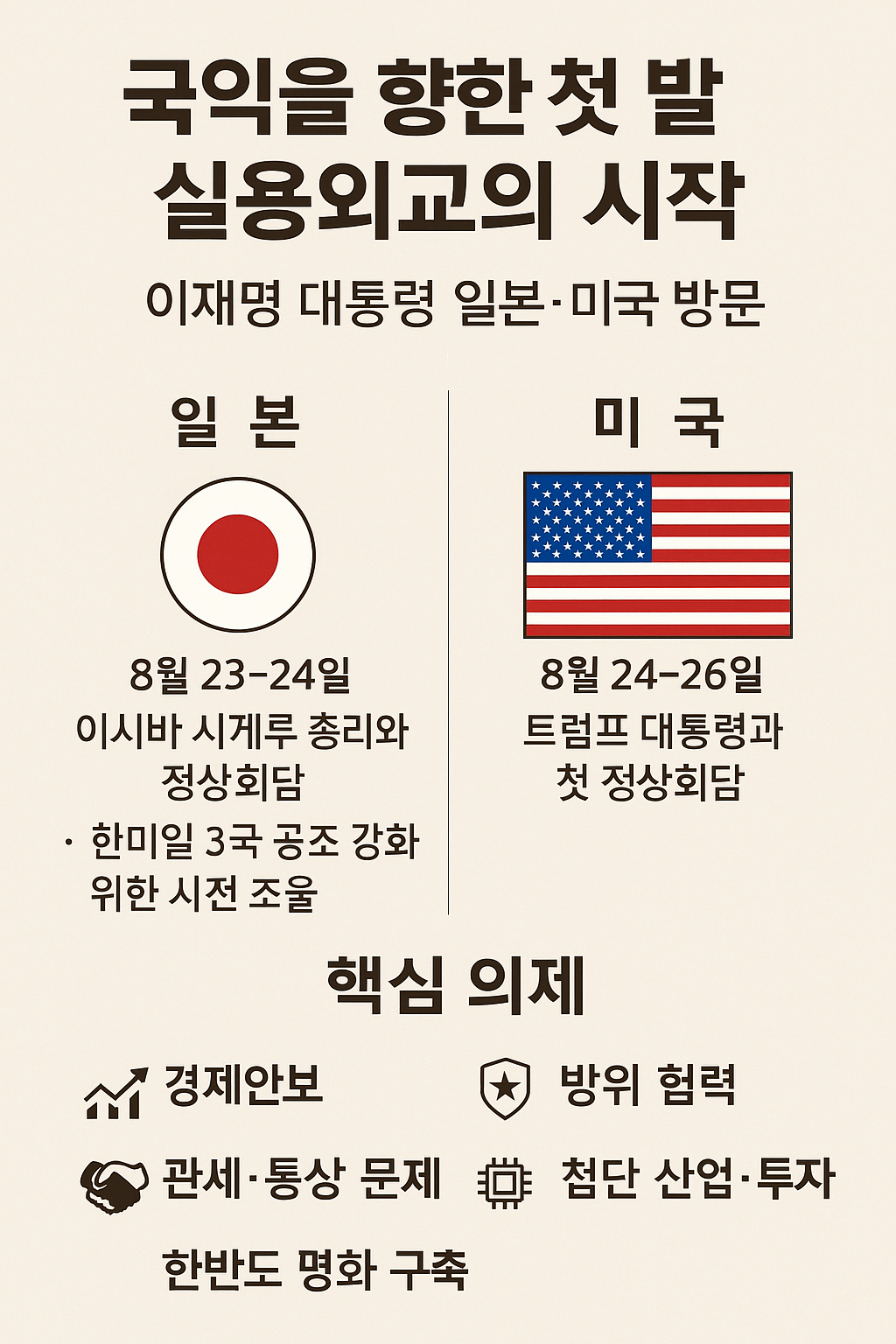 따라서 이번 일본 방문은 미국과의 협상을 위한 ‘전략적 전주곡’이자, 동북아 외교의 판을 다시 짜는 중요한 첫 수입니다.